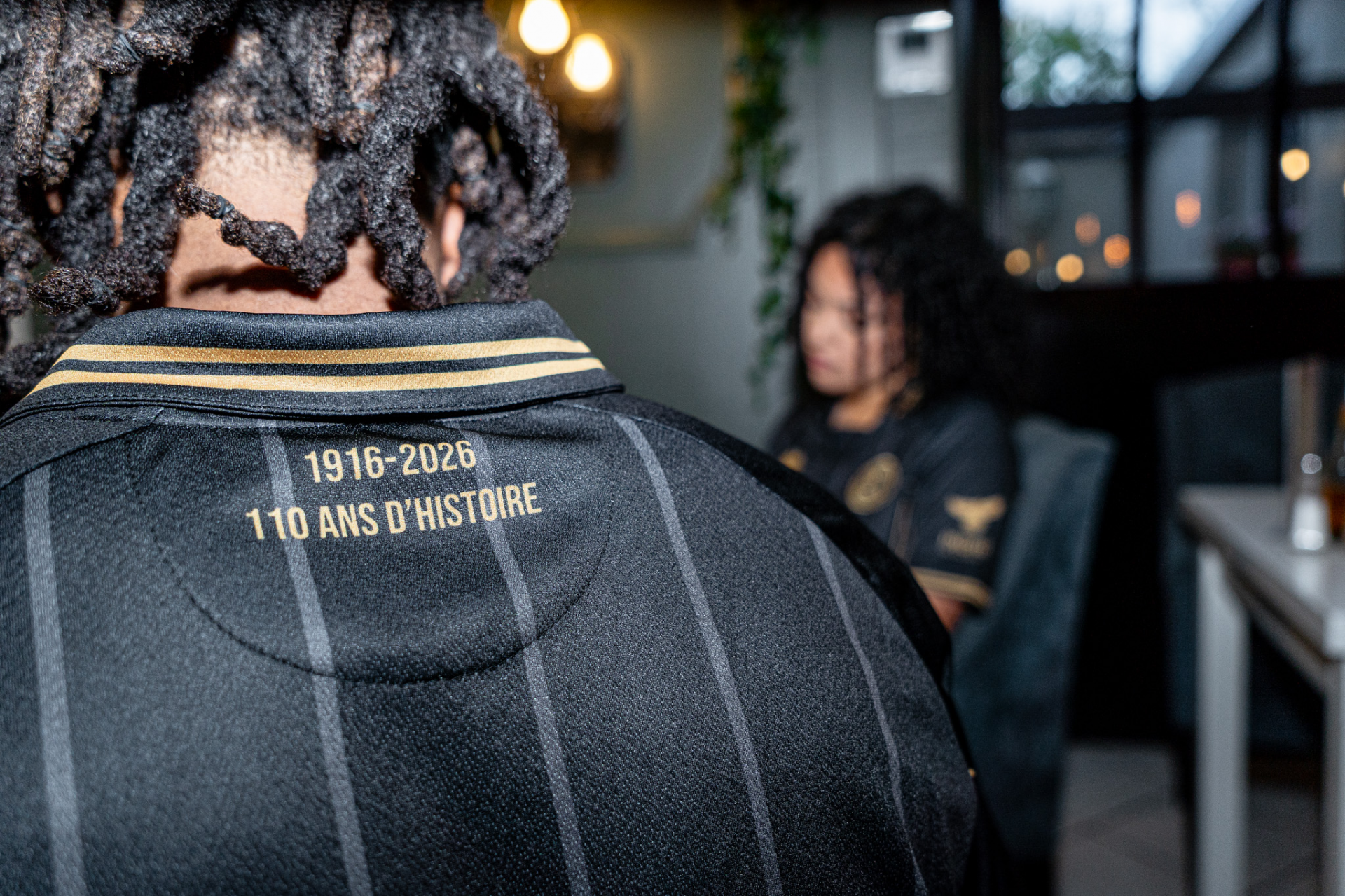 Sur la poitrine, le logo du club est mis en valeur avec une finition dorée, rappelant la noblesse de cet anniversaire historique. Le sponsor central, également traité en or, s’intègre harmonieusement à l’ensemble, renforçant la lisibilité et l’homogénéité visuelle.