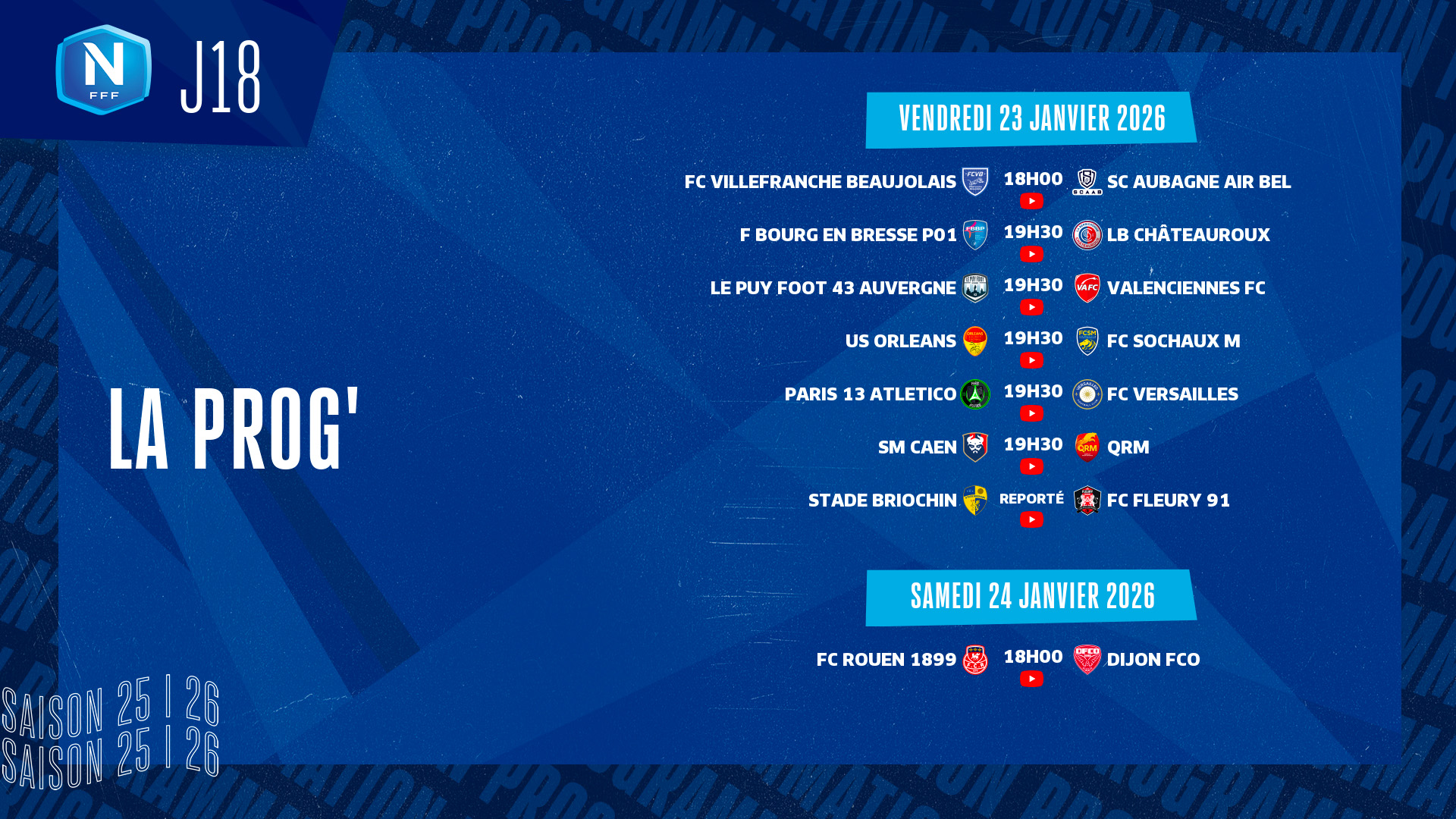 La rencontre sera à suivre en direct à partir de 19h15 sur notre site et sur la chaîne YouTube du Championnat de National en cliquant ici.
